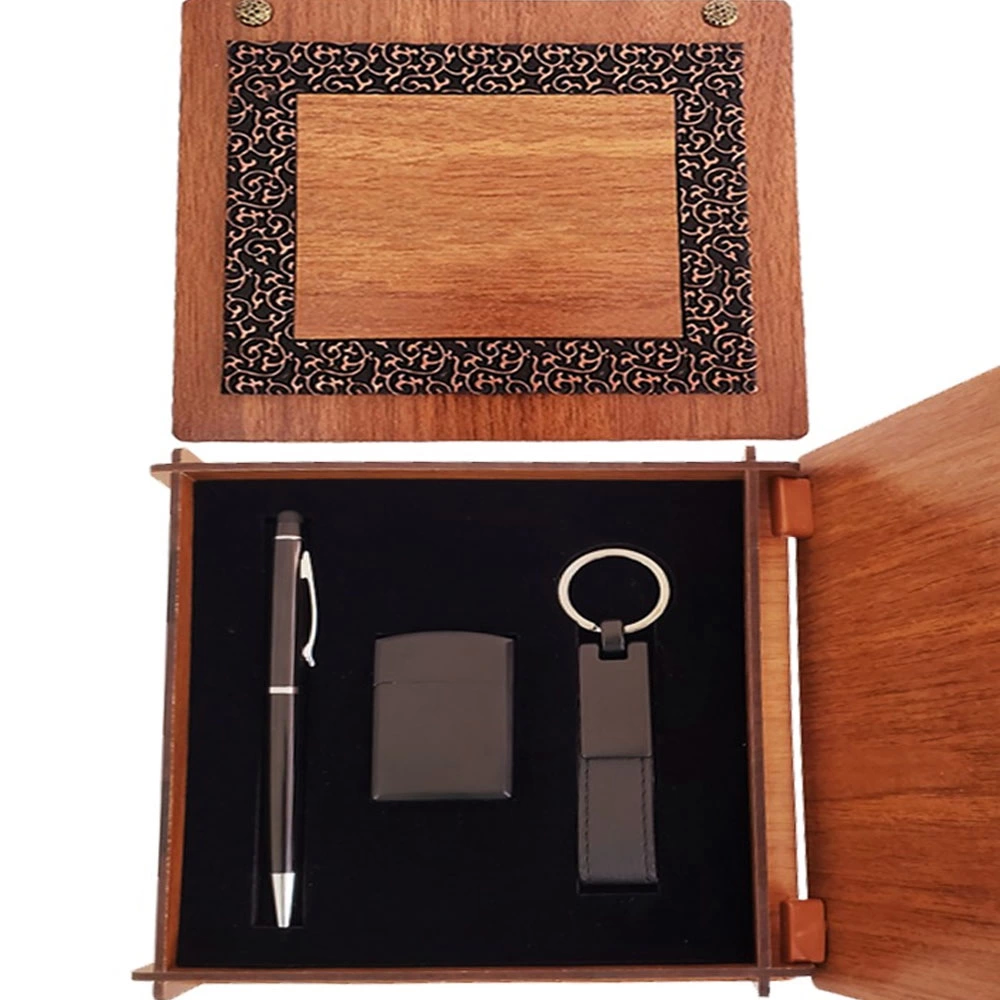 Ahşap Kutulu Siyah Kalem Anahtarlık ve Mat Çakmak Seti