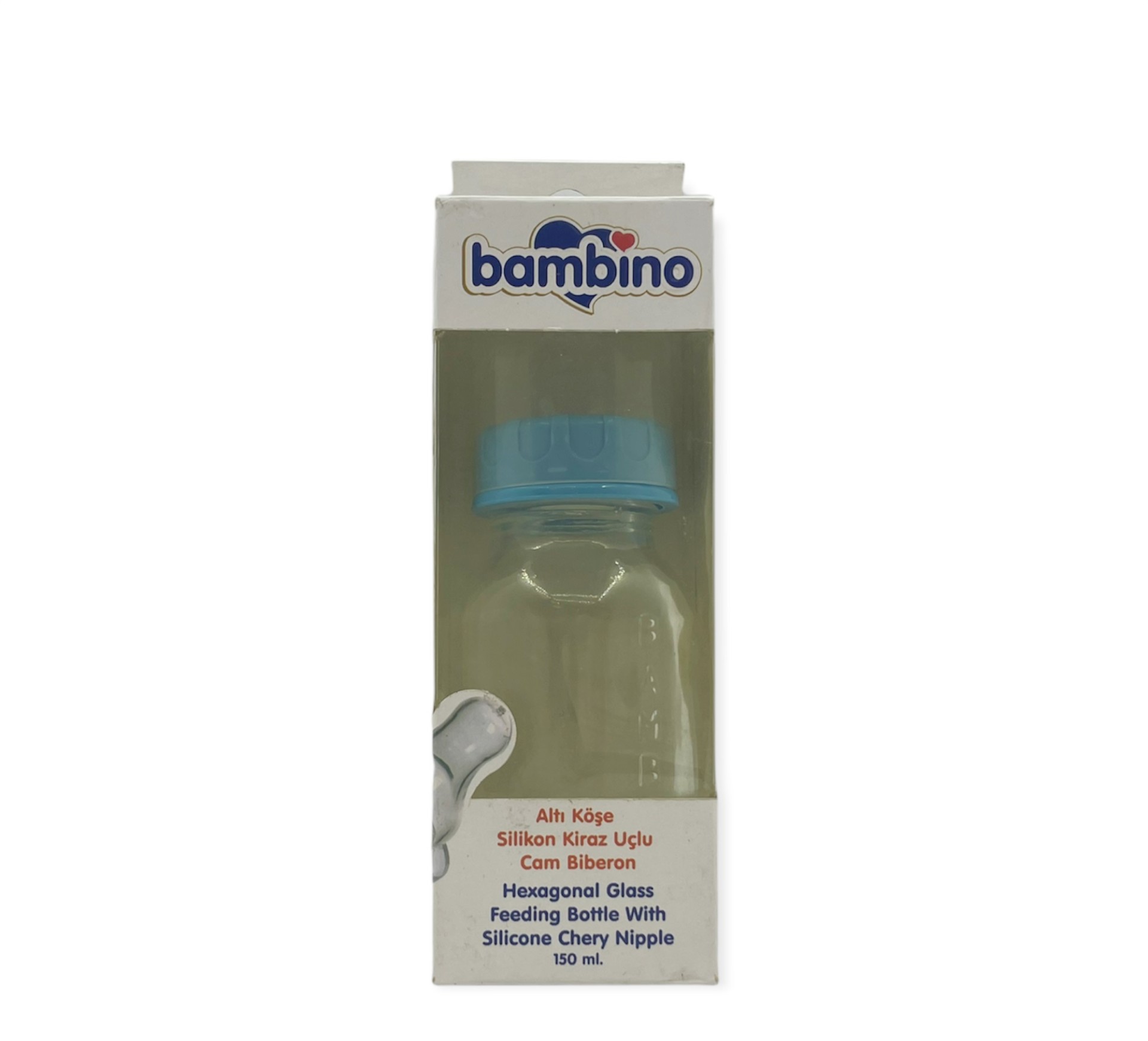 Bambino Altı Köşe Silikon Kiraz Uçlu Cam Biberon 150ml - Mavi
