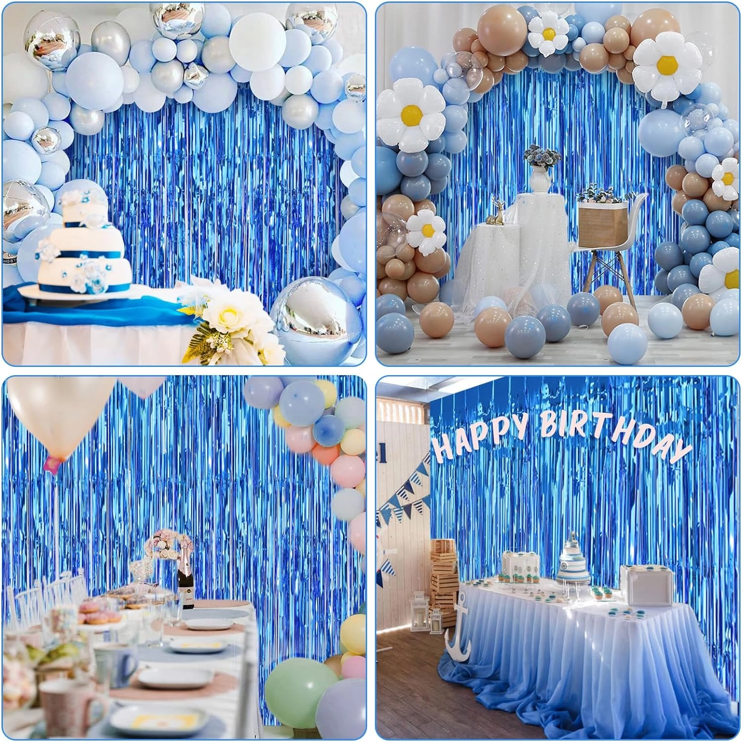 Mavi renk ekstra metalize parlak saçaklı arka fon perdesi ile özel günlerinize ve kutlamalarınıza göz kamaştırıcı bir ışıltı katın İthal A kalite malzemeden üretilen bu perde, 1x2 metre boyutuyla her türlü dekorasyona uyum sağlar.