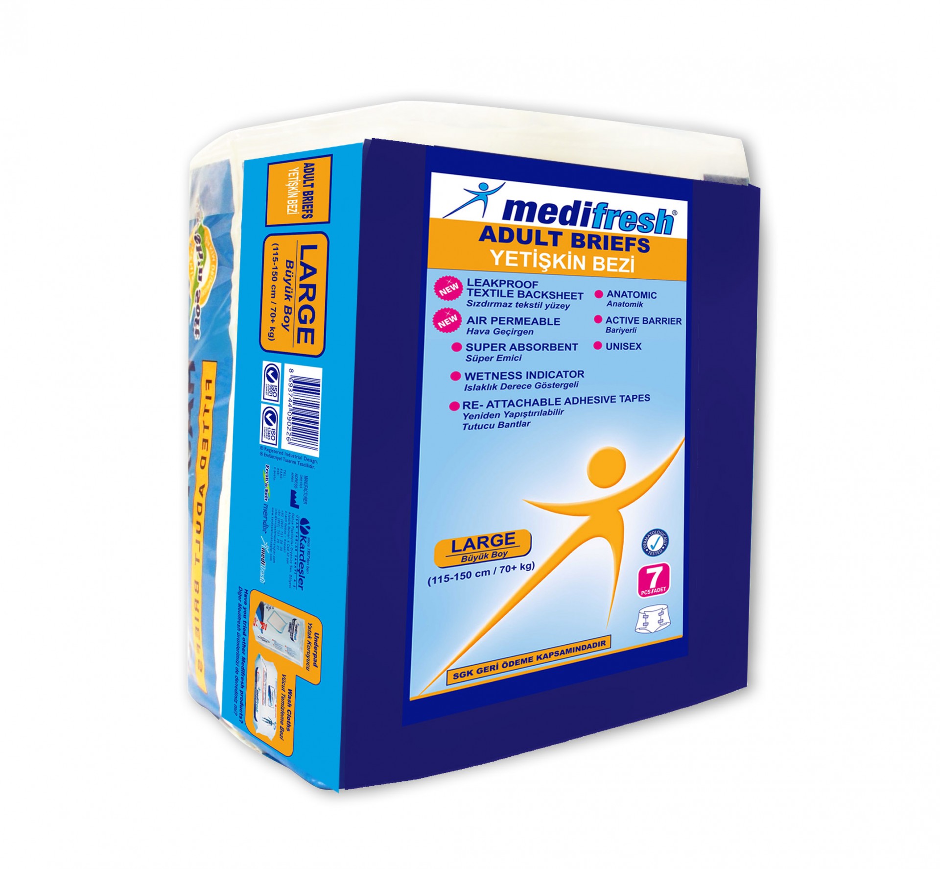 • Orta ve Büyük boy çeşitleri olan Medifresh Hasta Bezi, bel bantı sayesinde vücuda sıkıca tutunur, kaymaz